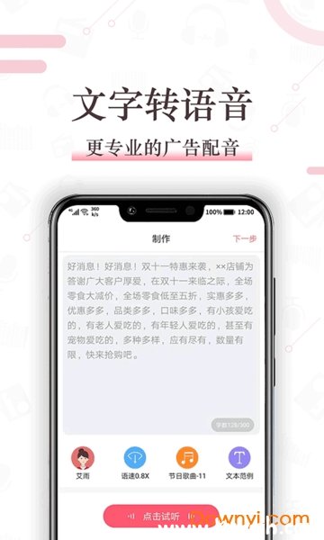 采用强大的语音合成技术,打造简单高效的配音服务平台。更有众多真人广告促销成品录音,一键导出。满足您的配音需求。