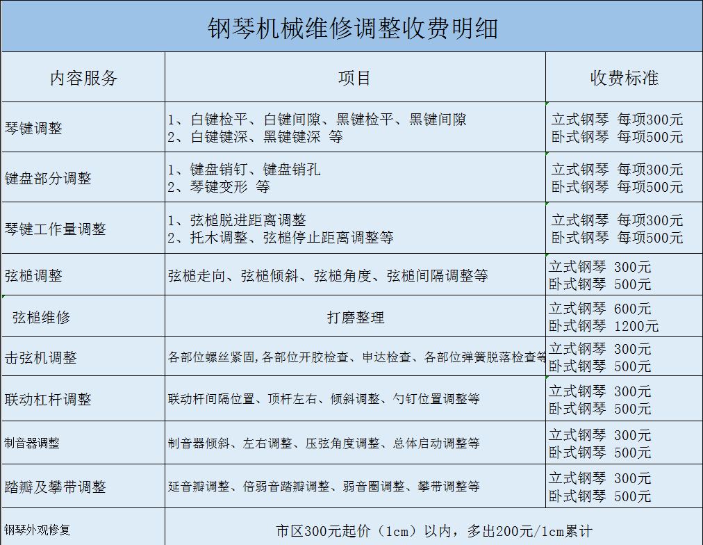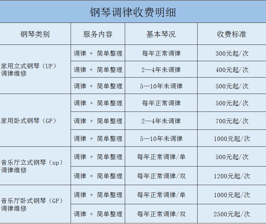 注:(1)根据钢琴使用频率:每天练习,建议一年调律2-3次,暖气来时调1次,暖气停了调1次;雨季调1次