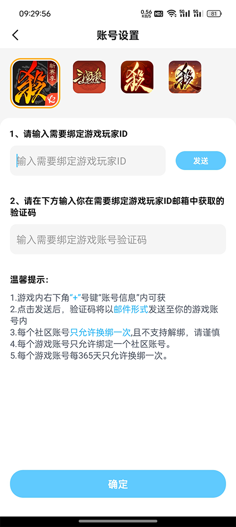 4、输入需要绑定的游戏ID,验证码确认需要绑定的账号。