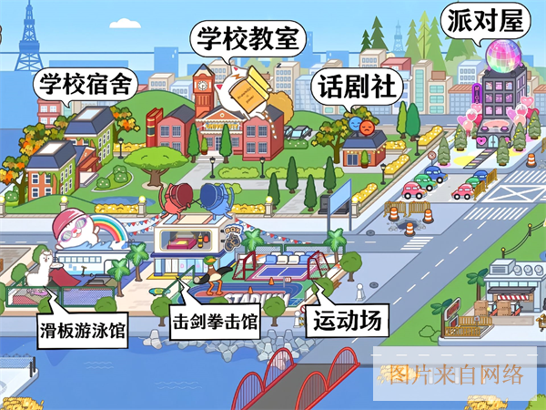11、学校宿舍、学校教室、派对屋、话剧社、滑板游泳馆、击剑拳击馆、运动场。