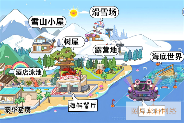 3、雪山小屋、滑雪场、树屋、露营地、酒店泳池、海鲜餐厅、海上派对、海底世界、豪华套房。