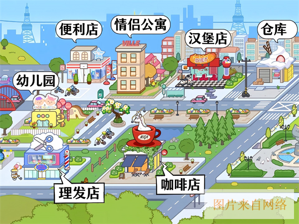14、幼儿园、理发店、咖啡店、仓库、汉堡店、情侣公寓、便利店。
