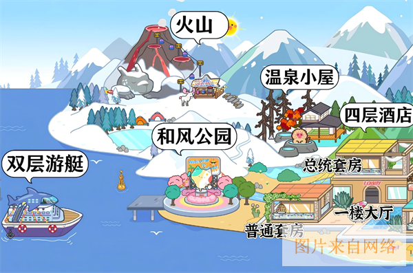 17、火山、双层游艇、和风公园、温泉小屋、四层酒店。